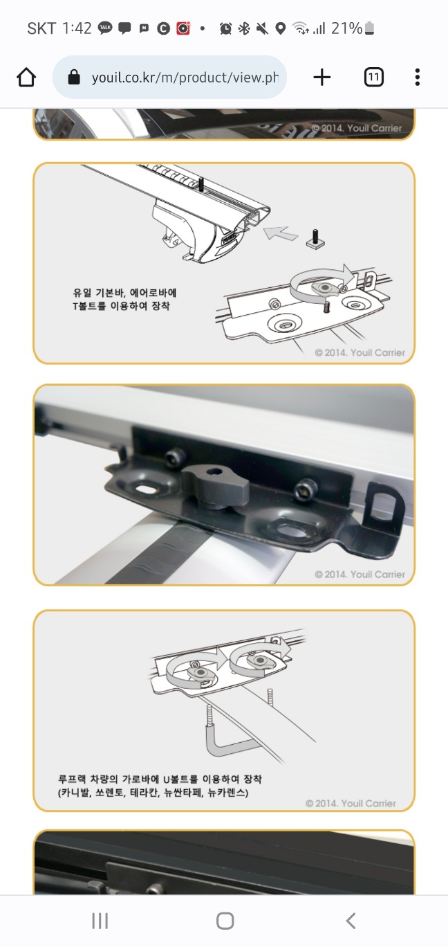 1. 기존 차량에는 유일 가로바에 T볼트를 사용해 고정하였으나 현재 차량은 가로바가 있어서 U볼트로